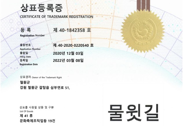 철원군은 이미 지난 8일 관광상품명인 물윗길에 대해 특허청 상표 등록을 마쳤다.