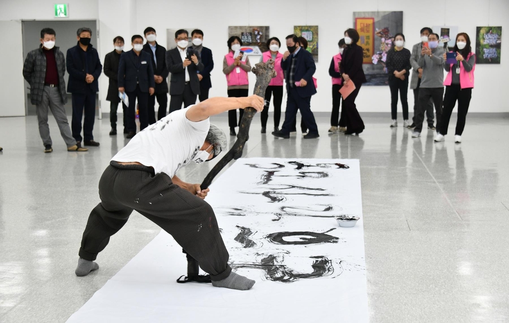 김씨는 15일 열린 사진전 개막식에서도 대형 붓으로 '독도 사랑은 국민의 의무'란 글씨를 쓰는 행위예술을 선보였다.