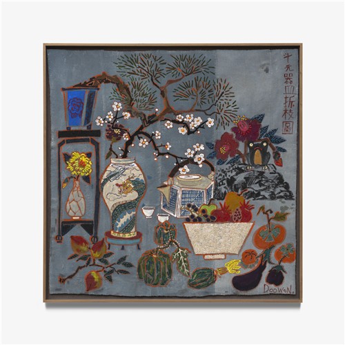 이두원은 인도, 파키스탄, 네팔 등 세계 각지를 여행하며 수집한 천연 재료와 한국 전통 먹을 결합해 즉흥적이고 자유로운 방식으로 작업하는 작가다. 이번에 선보인 2025년 작 '두원기명절지도'는 그의 대표 연작 '기명절지도'의 하나다. 울(양모)에 먹과 아크릴, 과슈, 자개 등 다양한 재료를 활용해 꽃과 도자기, 과일, 소나무 등 다양한 기물과 생명체를 화면 위에 자유롭게 올려놨다.