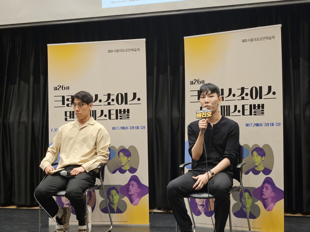 | ▲ 제26회 크리틱스초이스 댄스페스티벌 기자간담회 (서울=연합뉴스) 최주성 기자 = 4일 서울 대학로예술극장에서 열린 '2023 크리틱스초이스 댄스페스티벌' 기자간담회에서 신원민(왼쪽부터), 배진호 안무가가 작품을 설명하고 있다. 2023.7.4. cjs@yna.co.kr |