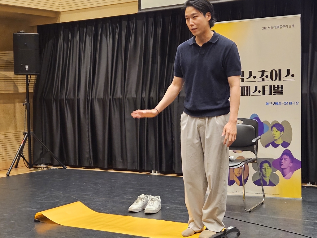 | ▲ 작품 설명하는 김용흠 안무가 (서울=연합뉴스) 최주성 기자 = 4일 서울 대학로예술극장에서 열린 '2023 크리틱스초이스 댄스페스티벌' 기자간담회에서 김용흠 안무가가 '지금은 미끄러지지만'을 설명하고 있다. 2023.7.4. cjs@yna.co.kr |