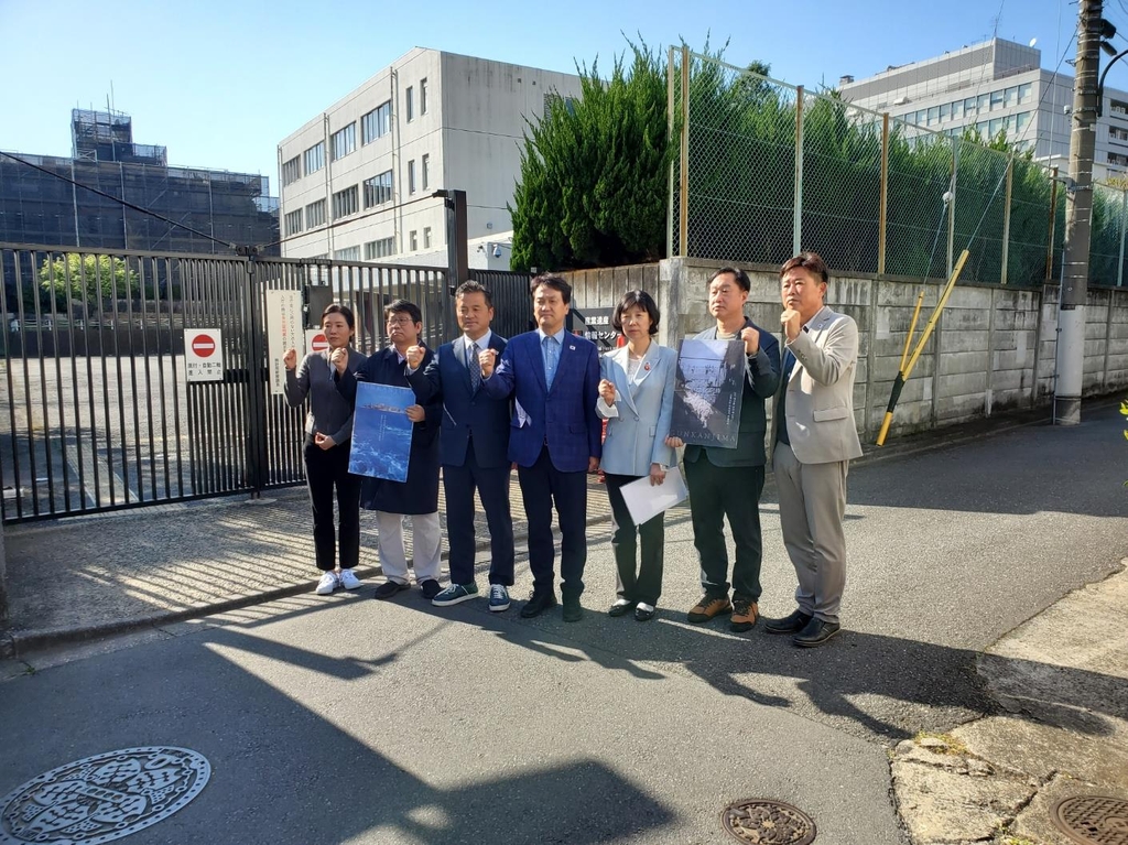(도쿄=연합뉴스) 김호준 특파원 = 일본을 방문 중인 야권 국회의원 3명이 9일 도쿄 산업유산정보센터 앞에서 기자회견을 열고 조선인 강제노역 현장인 사도광산의 유네스코 세계문화유산 등재를 막겠다고 다짐했다.