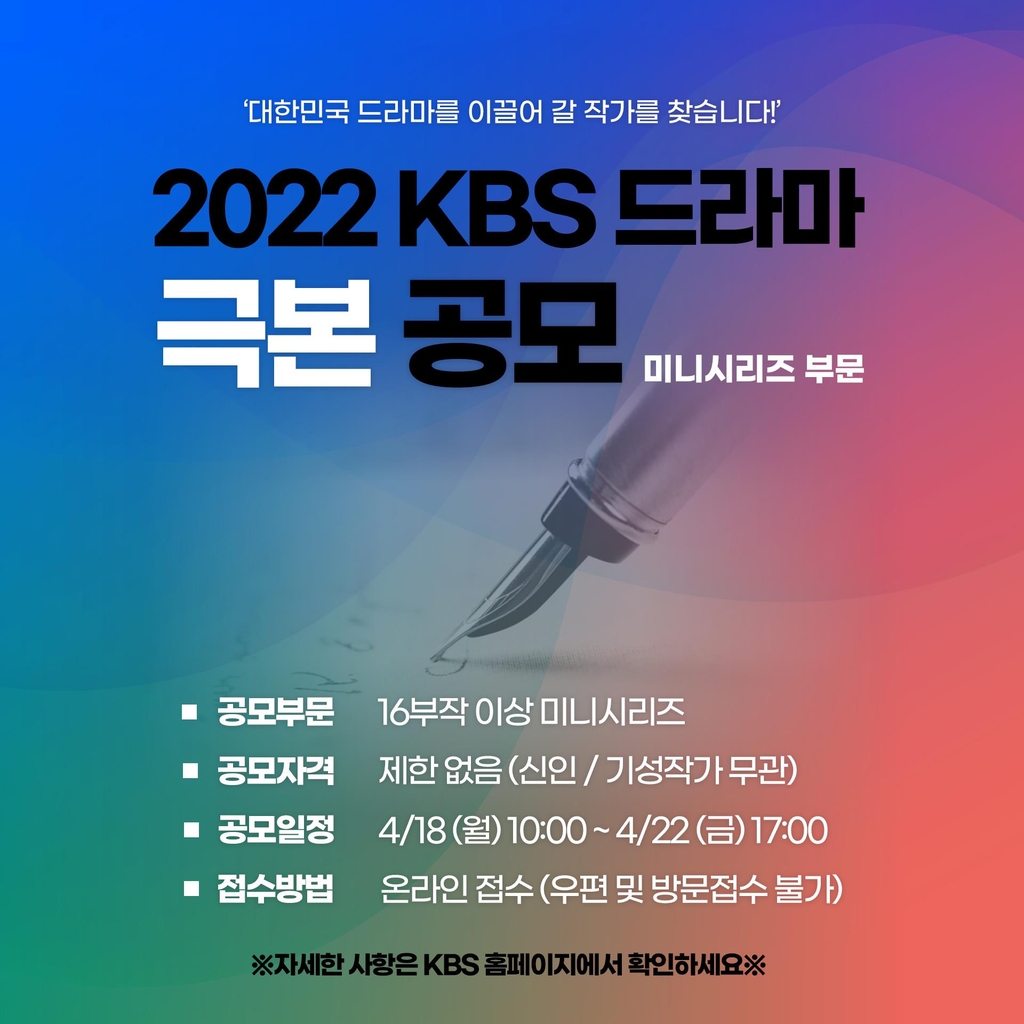 자세한 내용은 KBS 홈페이지(program.kbs.co.kr/special/drama/contest)에서 확인할 수 있다.