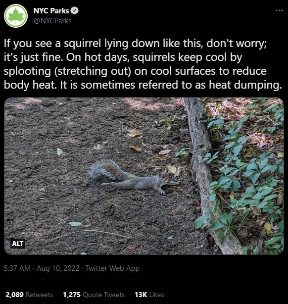 | ▲ "대자로 뻗은 다람쥐 걱정마세요. 더위 식히는 중" 뉴욕시 공원관리 당국 트위터 캡처. 재판매 및 DB 금지 |