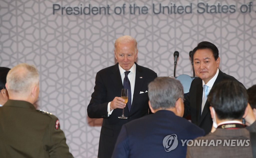 | ▲ 건배 제의하는 조 바이든 미국 대통령 (서울=연합뉴스) 서명곤 기자 = 조 바이든 미국 대통령이 21일 오후 서울 용산 국립중앙박물관에서 열린 환영 만찬에서 건배 제의를 하고 있다. 2022.5.21 seephoto@yna.co.kr |