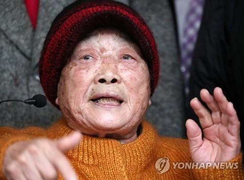 ▲ A victim of Japan's wartime forced labor speaks during a press conference in front of the Supreme Court in southern Seoul on Nov. 29, 2018, after the court ruled Japanese firms should compensate forced labor victims. (Yonhap)