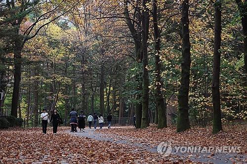 ▲ People enjoy a walk in a park in Gwacheon, south of Seoul, on Nov. 1, 2023. (Yonhap)