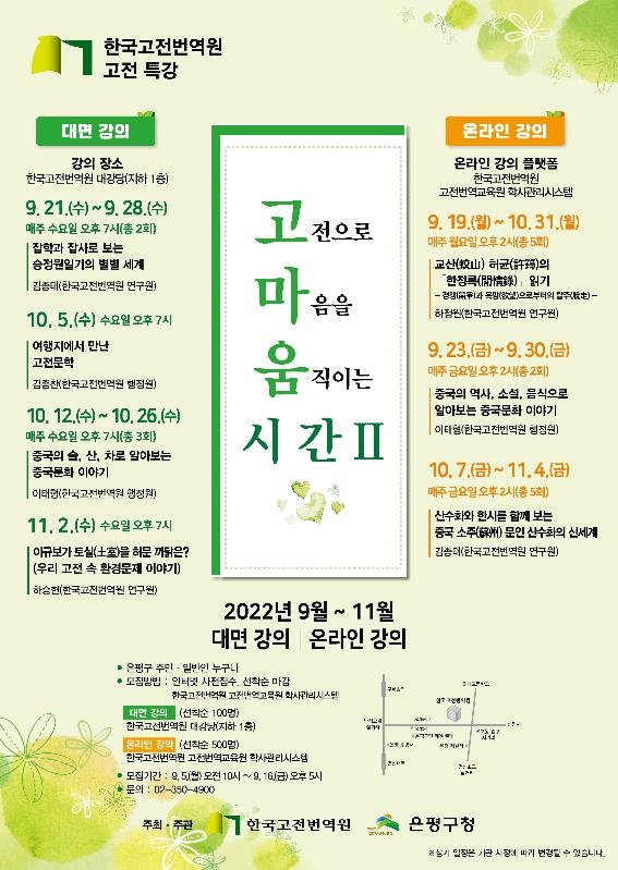 ▲ 한국고전번역원 '시민 고전 특강' = 한국고전번역원은 서울 은평구청과 함께 시민을 대상으로 한 고전 특강 '고전으로 마음을 움직이는 시간 2'를 진행한다.