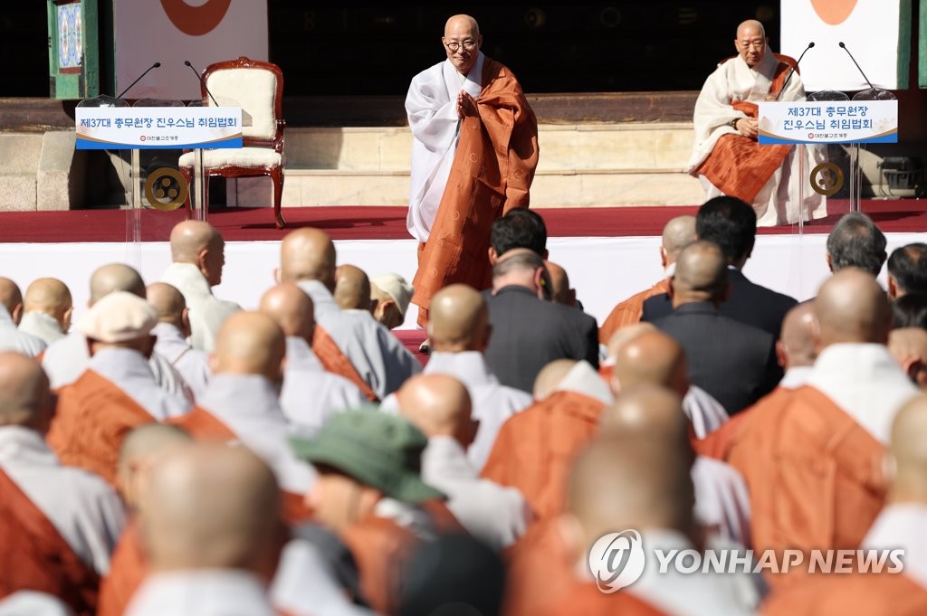 ▲ 조계종 총무원장 진우스님 취임법회 (서울=연합뉴스) 신준희 기자 = 5일 종로구 조계사에서 제37대 조계종 총무원장 진우스님 취임법회가 열리고 있다. 2022.10.5 hama@yna.co.kr