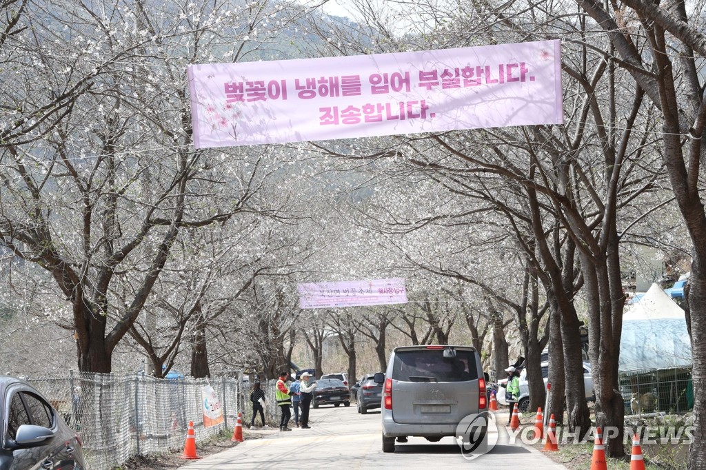 ▲ 벚꽃축제 행사장 들어서는 차량 (춘천=연합뉴스) 강태현 기자 = '제1회 북산면 벚꽃축제' 개막식이 열린 10일 강원 춘천시 북산면 부귀리 일대에서 시민들이 벚꽃을 감상하고 있다. 예년보다 일찍 핀 벚꽃에 춘천시가 축제와 개막식 일정을 앞당겨 진행했으나 냉해로 인해 꽃잎이 빨리 떨어지자 이에 사과하는 현수막이 달려 있다. 2023.4.10 taetae@yna.co.kr