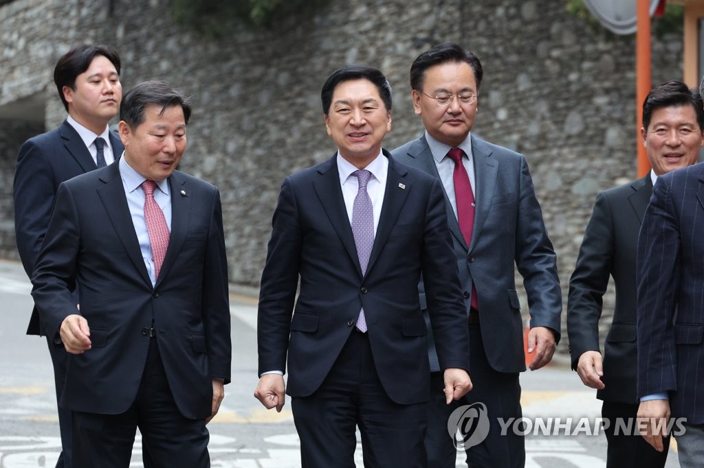 | ▲ Ruling People Power Party leader Kim Gi-yeon (C) enters former President Lee Myung-bak's personal residence in southern Seoul on March 15, 2023. (Yonhap) |