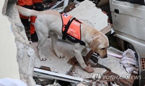 | ▲ Rescue dog Tobaek searches for earthquake survivors in Antakya, Turkey, on Feb. 10, 2023, with a bandage around one of his front legs. (Yonhap) |