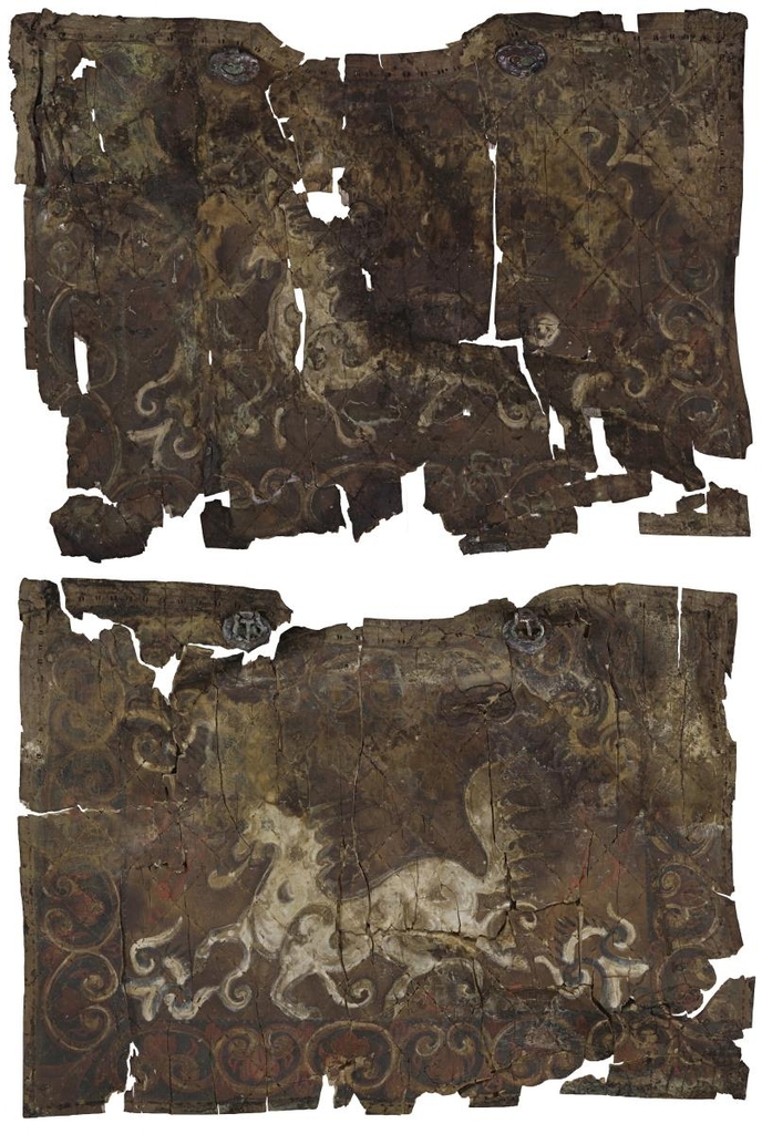 | ▲ 천마가 그려진 말다래 1973년 발굴 조사 당시 천마가 그려진 말다래는 2점이 위아래로 겹쳐서 출토됐다. 아래가 우리에게 잘 알려진 그림. [국립경주박물관 제공. 재판매 및 DB 금지] |