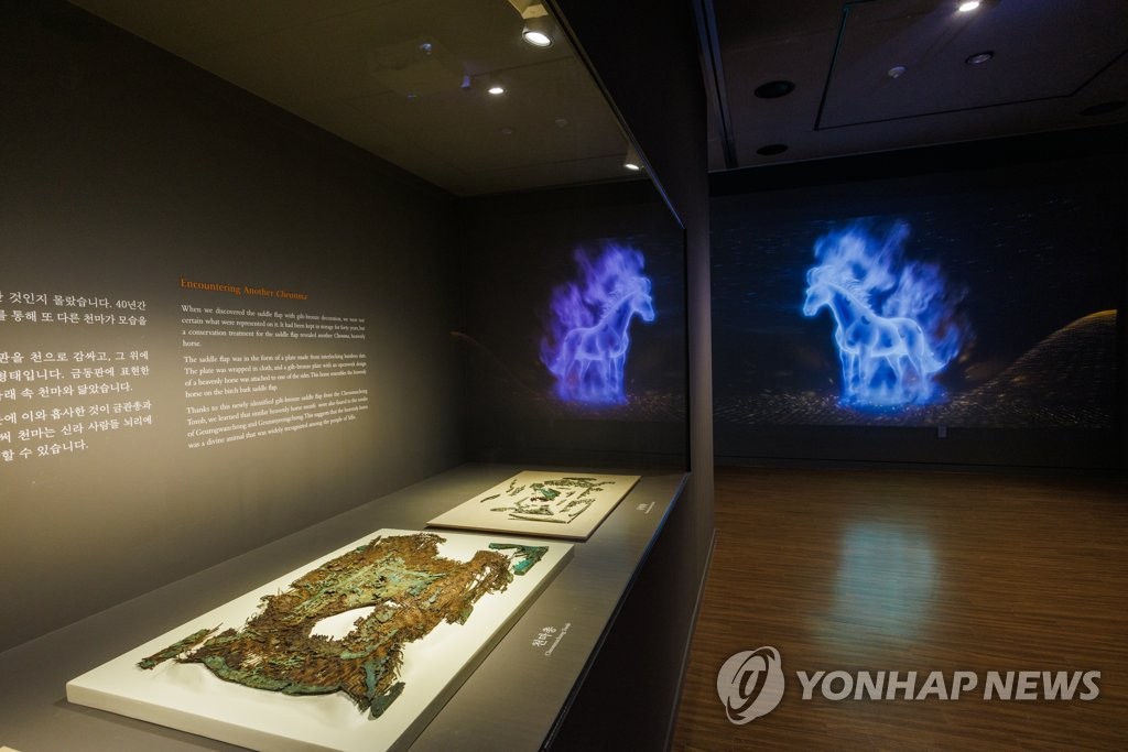 | ▲ 국립경주박물관, 특별전 '천마, 다시 만나다' 개최 (서울=연합뉴스) 국립경주박물관이 천마총 발굴 50주년을 기념해 4일부터 오는 7월 16일까지 특별전시관에서 '천마, 다시 만나다'를 개최한다고 밝혔다. 사진은 특별전 '3부. 다시 만난 천마의 이야기' 모습. 2023.5.4 [국립경주박물관 제공. 재판매 및 DB 금지] photo@yna.co.kr |