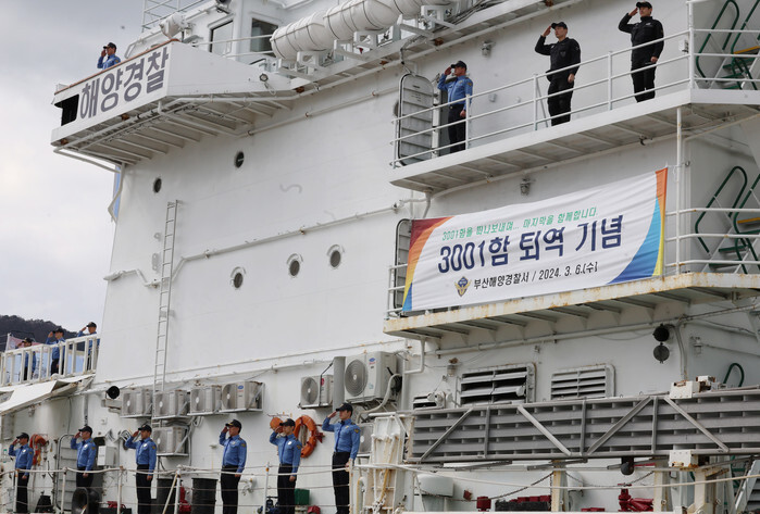 A retirement ceremony for the Korea Coast Guard's 3,000-ton patrol boat, the 3001, takes place after its 30 years of service at the pier of the Busan Coast Guard in the country's largest port city on March 6, 2024. (Yonhap)