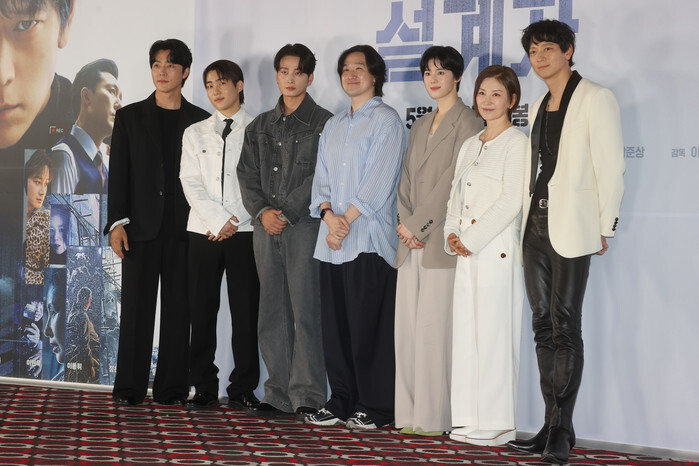 The stars of the new movie "The Plot" -- Kang Dong-won, Lee Mi-sook, Jung Eun-chae, Lee Hyun-wook, Tang Jun-sang and Lee Moo-saeng (L to R) -- along with director Lee Yo-sub (C) -- pose for a photo during a publicity event in Seoul on May 23, 2024, to promote the movie that is set to hit local screens in South Korea on May 29. (Yonhap)