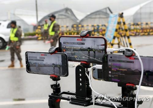 | ▲ Some reporters from foreign media live broadcast the arrival of BTS member J-Hope at an Army boot camp in Wonju, 87 kilometers southeast of Seoul, using smartphones, on April 18, 2023. (Yonhap) |