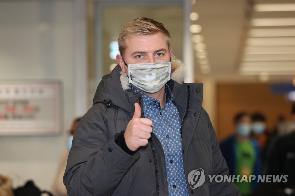 | ▲ In this file photo from Jan. 16, 2021, Artie Lewicki of the SK Wyverns gives a thumbs-up after arriving at Incheon International Airport, west of Seoul. (Yonhap) |
