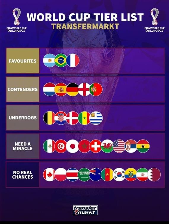 트랜스퍼마르크트는 14일 인스타그램에 본선 32개국을 5개 그룹으로 분류한 그래픽을 올리면서 이용자들에게 '동의하나요'라는 질문을 던졌다.