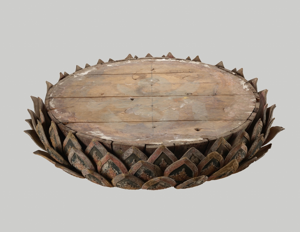 크기는 지름 124.3㎝, 높이 24.7㎝다. 나무를 깎아 연꽃 형태를 입체적으로 만들고, 금빛 선과 문양으로 꽃잎 표면을 장식한 점이 특징이다.