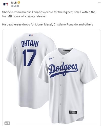 MLB는 스포츠 의류 판매업체 '패너틱스'(Fanatics)의 통계를 근거로 "오타니가 크리스티아누 호날두, 리오넬 메시 등을 제치고 최다 기록을 작성했다"고 소셜미디어 엑스(X, 옛 트위터)를 밝혔다.