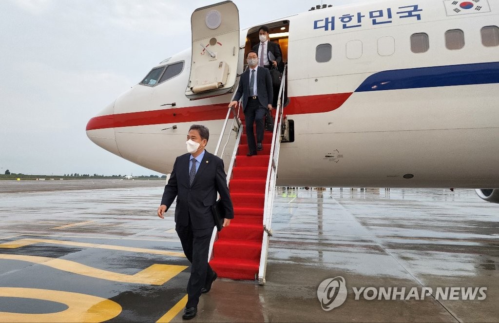 | ▲ South Korean Foreign Minister (front) steps off a plane upon his arrival in the eastern Chinese port city of Qingdao on Aug. 8, 2022, in this photo provided by his office. (PHOTO NOT FOR SALE) (Yonhap) |