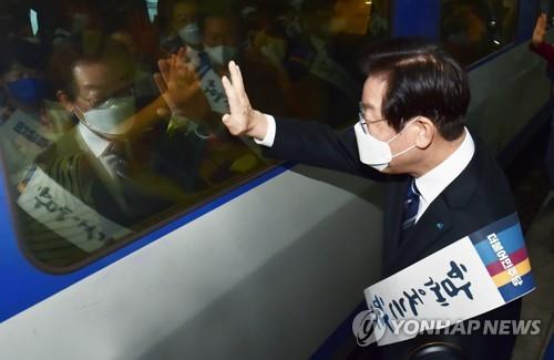 | ▲ Democratic Party Chairman Lee Jae-myung waves to travelers on a train at Yongsan Station, central Seoul, on Sept. 8, 2022, ahead of the four-day Chuseok holiday. (Pool photo) (Yonhap) |