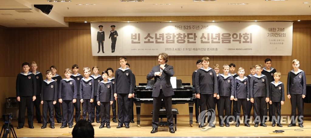 | ▲ 빈 소년합창단 '창단 525주년 기념 내한 투어' (서울=연합뉴스) 이재희 기자 = 26일 오후 서울 서초구 코스모스아트홀에서 열린 '빈 소년합창단 창단 525주년 기념 내한 투어' 기자간담회에서 마놀로 까닌 지휘자와 합창단이 시연하고 있다. 2023.1.26 scape@yna.co.kr |