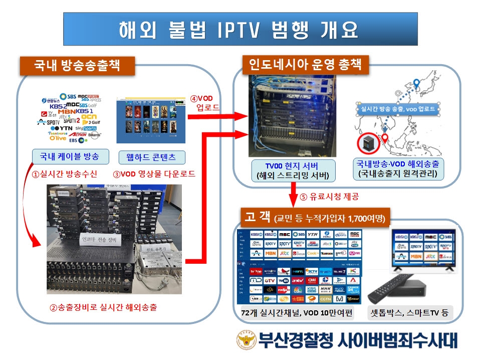 부산경찰청 사이버범죄수사대는 최근 저작권법 위반 혐의로 해외 IPTV 운영 총책 A씨 등 2명을 구속하고 1명을 불구속 입건했다고 4일 밝혔다.