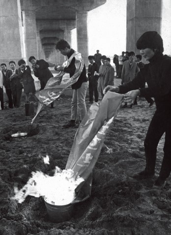 | ▲ 강국진, 정강자, 정찬승,〈한강변의 타살〉, 1968, 1968년 10월 17일 제2한강교(현재의 양화대교) 아래 강변에서 열린 퍼포먼스의 기록, 국립현대미술관 미술연구센터 소장 ⓒ 황양자 [국립현대미술관 미술연구센터, 김미경 컬렉션 제공, 재판매 및 DB금지] |