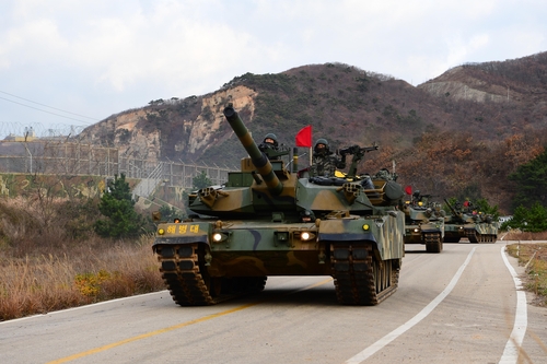 | ▲ K-1 armored vehicles conduct joint defense drills for northwestern islands, in this photo provided by the Marine Corps. on Nov. 23, 2023. (PHOTO NOT FOR SALE) (Yonhap) |