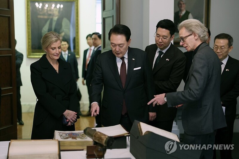 | ▲ South Korean President Yoon Suk Yeol (C) looks at an exhibition at the Royal Society, Britain's national academy of sciences, in London on Nov. 22, 2023. (Yonhap) |