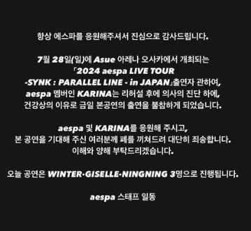 그러면서 "이날 공연은 윈터, 지젤, 닝닝 3명으로 진행한다"고 덧붙였다.