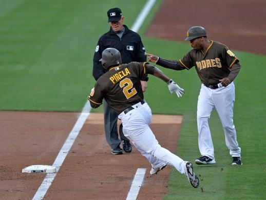 | ▲ Johnny Washington (R), then first base coach for the San Diego Padres, points to second base as Jose Pirela makes the turn, in this 2017 file photo provided by Washington. (PHOTO NOT FOR SALE) (Yonhap) |