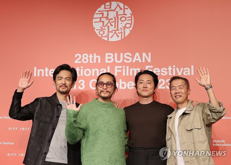 | ▲ 부산영화제 찾은 한국계 영화 감독과 배우들 (부산=연합뉴스) 이재희 기자 = 부산국제영화제(BIFF) 개막 사흘째인 6일 오후 부산 해운대구 KNN시어터에서 열린 '코리안 아메리칸 특별전: 코리안 디아스포라' 기자회견을 마치고 배우 존 조(왼쪽부터), 저스틴 전 감독, 배우 스티븐 연, 정이삭 감독이 포즈를 취하고 있다. 2023.10.6 scape@yna.co.kr |