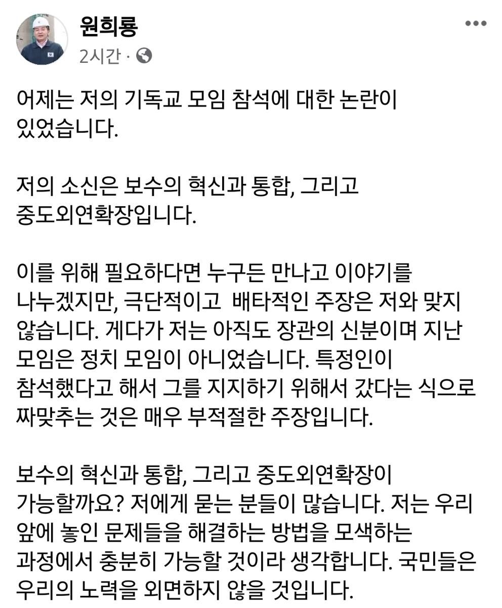 | ▲ 기독교 모임 논란에 입장 밝히는 원희룡 장관 [원희룡 국토부 장관 SNS 캡처] |