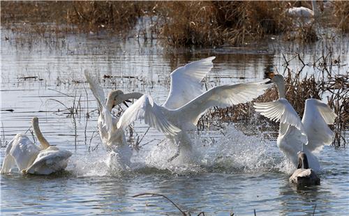 (강릉=연합뉴스) 유형재 기자 = 흔히 백조로 불리는 우아함의 대명사인 큰고니가 유에프씨(UFC) 선수처럼 먹이 공간 확보를 위해 치열한 경쟁을 벌이고 있어 안타까움을 사고 있다.
