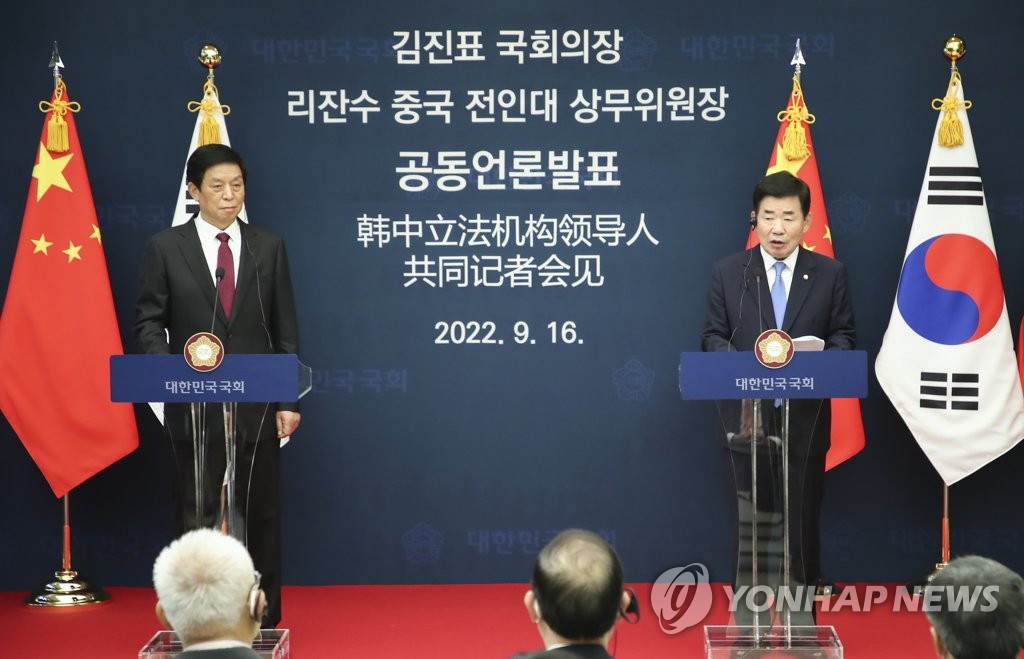 ▲ National Assembly Speaker Kim Jin-pyo (R) and Li Zhanshu, China's third-highest-ranking official and chief of the Standing Committee of the National People's Congress, attend a joint press briefing following their meeting at the National Assembly on Sept. 16, 2022. (Pool photo) (Yonhap)