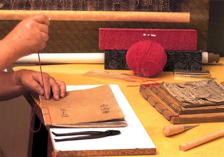 | ▲ 배첩 과정 가운데 표지실을 매는 장면 [문화재청 국가문화유산포털 제공. 재판매 및 DB 금지] |