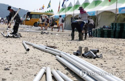 ▲ Sun shelters are dismantled at the World Scout Jamboree campground in Saemangeum, southwestern South Korea, on Aug. 7, 2023, ahead of an early departure of participants set to begin on Aug. 8. (Yonhap)