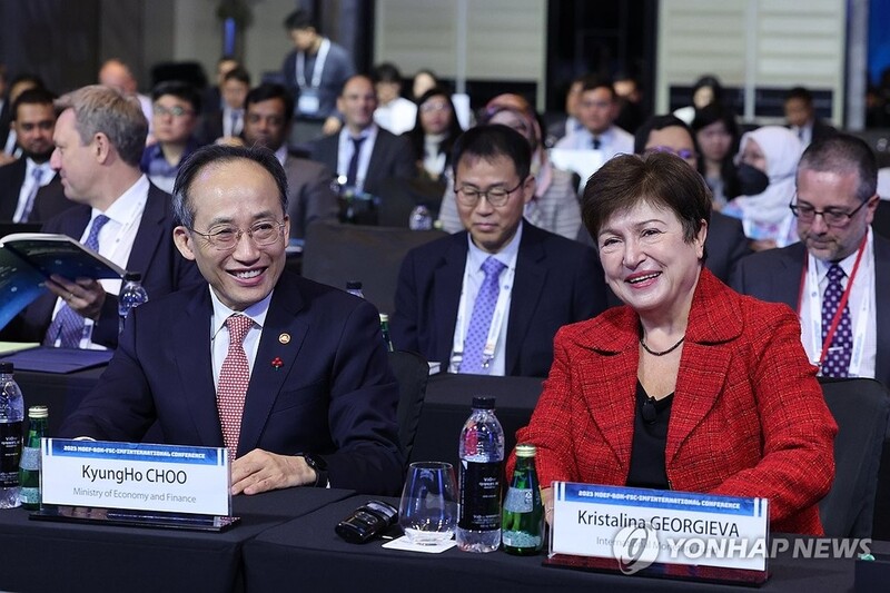 | ▲ South Korean Finance Minister Choo Kyung-ho (L) sits with International Monetary Fund Managing Director Kristalina Georgieva at an international conference on digital money in Seoul, Dec. 14, 2023. (Yonhap) |
