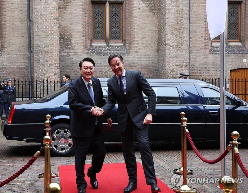 | ▲ President Yoon Suk Yeol (L) shakes hands with Dutch Prime Minister Mark Rutte as he arrives at Rutte's office in The Hague for their summit on Dec. 13, 2023. (Yonhap) |
