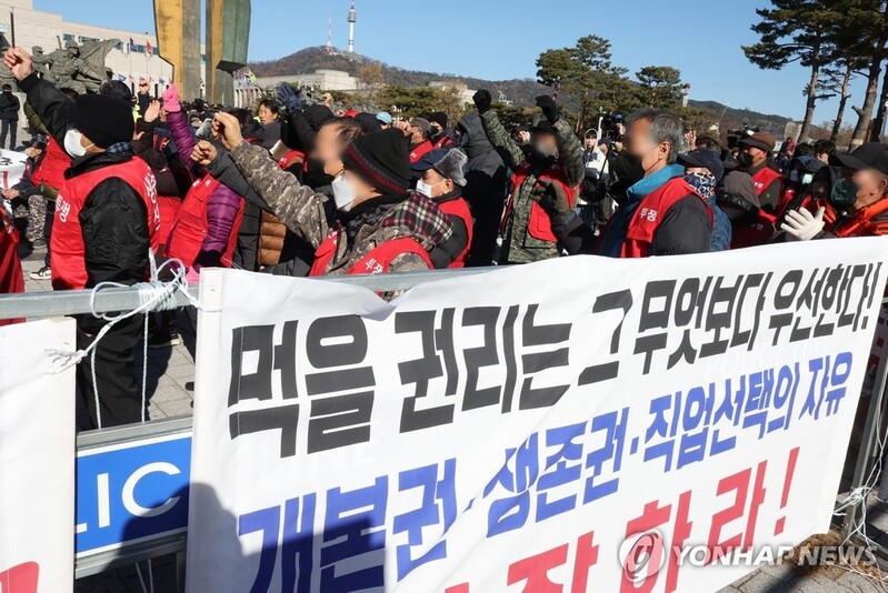 | ▲ Members of the Korean Dog Meat Association urge an end to a proposed bill banning the consumption of dog meat during their rally in front of the presidential office in Seoul in this file photo taken Nov. 30, 2023. (Yonhap) |