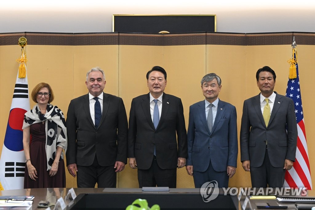 | ▲ South Korean President Yoon Suk Yeol (C) poses for a photo with White House Indo-Pacific coordinator Kurt Campbell (2nd from L), U.S. Assistant Secretary of Defense for Acquisition Cara Abercrombie (far L), South Korea's National Security Adviser Cho Tae-yong (2nd from R) and Principal Deputy National Security Adviser Kim Tae-hyo at the presidential office in Seoul on July 18, 2023, during the inaugural session of the newly established Nuclear Consultative Group between South Korea and the United States, in this file photo released by the presidential office. (PHOTO NOT FOR SALE) (Yonhap) |