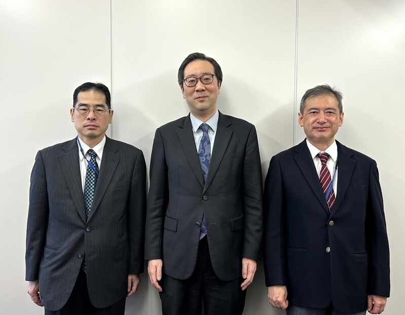 | ▲ Lee Jun-il (C), the director-general for North Korean nuclear affairs at South Korea's foreign ministry, poses for a photo prior to his talks with Hamamoto Yukiya (L), Japan's new deputy nuclear envoy, and other Japanese diplomats on Dec. 8, 2023, in this photo provided by the ministry. (PHOTO NOT FOR SALE) (Yonhap) |