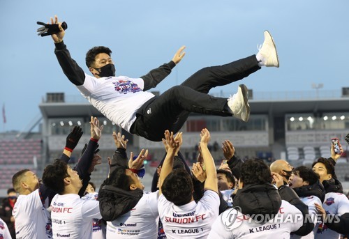 | ▲ Suwon FC players toss their head coach Kim Do-kyun in the air to celebrate their promotion to the K League 1 after a 1-1 draw with Gyeongnam FC in their K League 2 promotion playoff match at Suwon Sports Complex in Suwon, 45 kilometers south of Seoul, on Nov. 29, 2020. (Yonhap) |