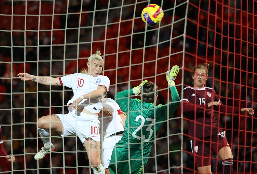 ▲ 잉글랜드와 라트비아의 여자축구 월드컵 지역 예선 (동커스터[영국] 로이터/액션이미지=연합뉴스) 1일(한국시간) 영국 동커스터에서 열린 잉글랜드와 라트비아의 여자축구 월드컵 지역예선전에서 잉글랜드가 골을 넣고 있다. 2021.12.1