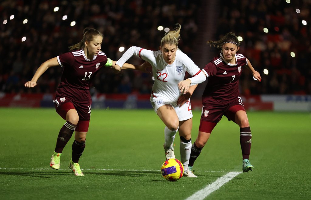 ▲ 잉글랜드와 라트비아의 여자축구 월드컵 지역 예선 (동커스터[영국] 로이터/액션이미지=연합뉴스) 1일(한국시간) 영국 동커스터에서 열린 잉글랜드와 라트비아의 여자축구 월드컵 지역예선전이 열렸다. 2021.12.1