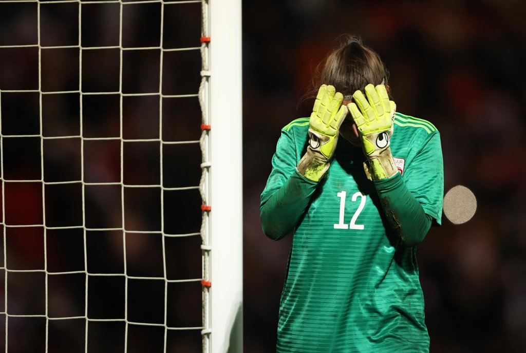 ▲ 잉글랜드와 라트비아의 여자축구 월드컵 지역 예선 (동커스터[영국] 로이터/액션이미지=연합뉴스) 1일(한국시간) 영국 동커스터에서 열린 잉글랜드와 라트비아의 여자축구 월드컵 지역예선전에서 라트비아 골키퍼 알리나 스클레메노바가 고개를 푹 숙이고 있다. 2021.12.1
