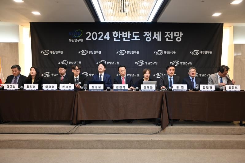 ▲ This photo, provided by the Korea Institute for National Unification on Dec. 13, 2023, shows the state-run think tank holding a press briefing in Seoul over its 2024 forecast of the security situation on the Korean Peninsula. (PHOTO NOT FOR SALE) (Yonhap)